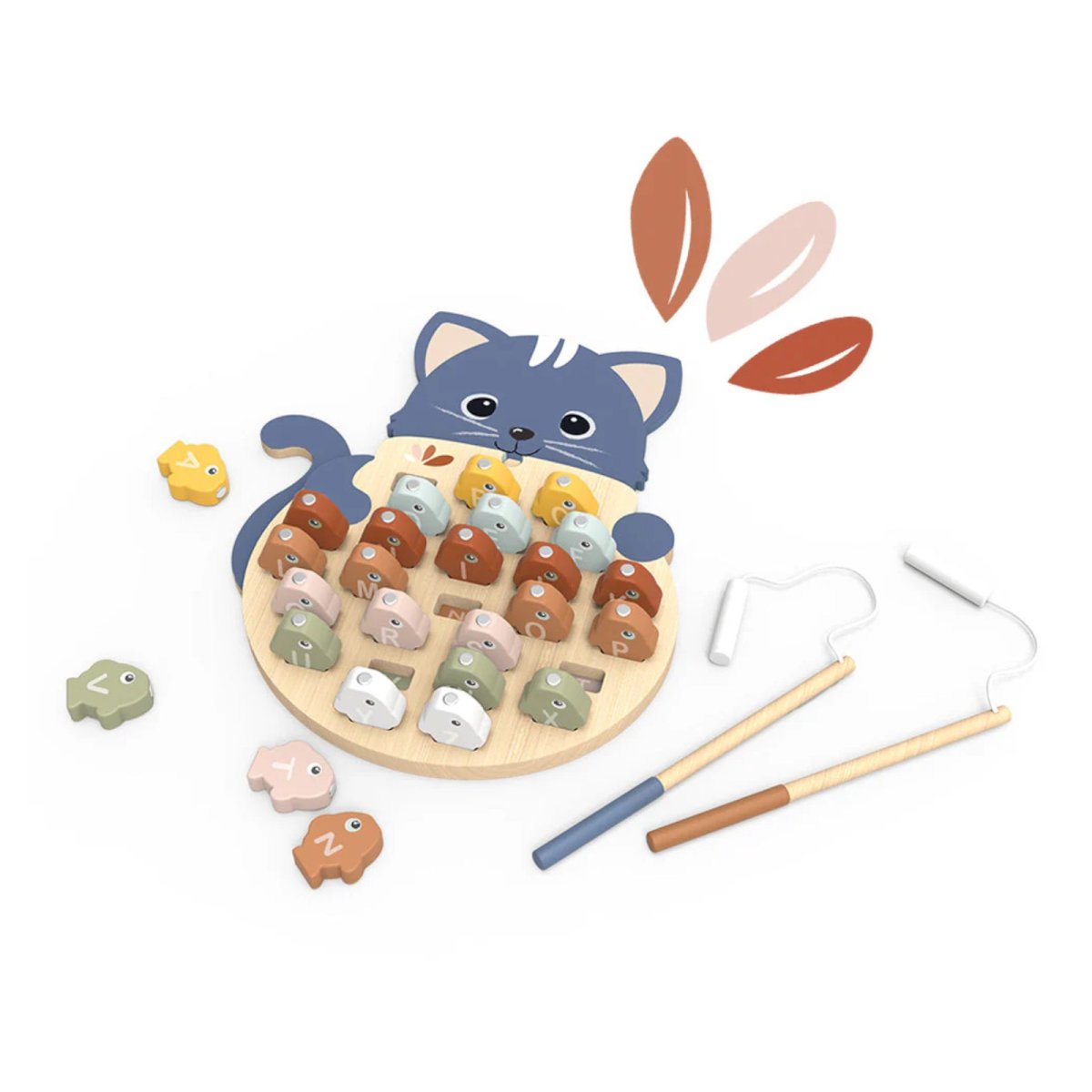 Chaque poisson en bois arbore une lettre de l'alphabet peinte de couleurs vives, permettant aux enfants de se familiariser avec la forme et l'ordre des lettres de manière ludique et interactive. Les cannes à pêche magnétiques sont faciles à prendre en main, favorisant la coordination œil-main et la concentration.